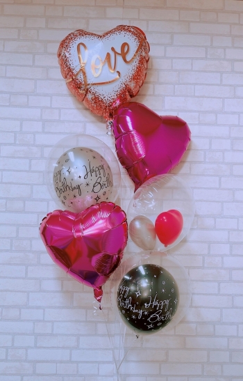 | 仕様 | メッセージ付ハートバルーン 1個 ピンクハートバルーン 2個 クリアバルーン(ハート総柄入り)2個 クリアバルーン(ハートバルーン3球入り)1個 |