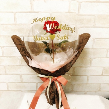 ドーム状のクリアバルーンの中に深紅のローズアートフラワー(造花)が入った新感覚のブーケです。バルーンに名前や記念日、ショートメッセージを入れることで世界に一つだけのオリジナルバルーンとなります。