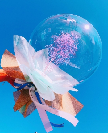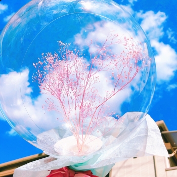 ドーム状のクリアバルーンの中にピンクのカスミ草(ドライフラワー)が入った新感覚のブーケです。プレゼントをもらった側だけでなく、渡す側もつい嬉しくなる新しいバルーンギフトです。