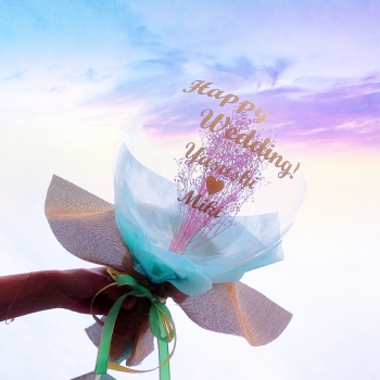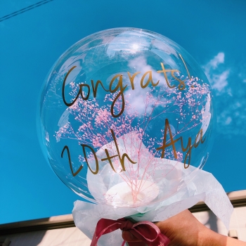 ドーム状のクリアバルーンの中にピンクのカスミ草(ドライフラワー)が入った新感覚のブーケです。バルーンに名前や記念日、ショートメッセージを入れることで世界に一つだけのオリジナルバルーンとなります。