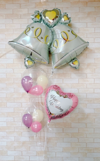 | 仕様 | ウェディングベル型バルーン 1個 メッセージ付バルーン 1個 クリアバルーン(ミニバルーン3球入)1個 |