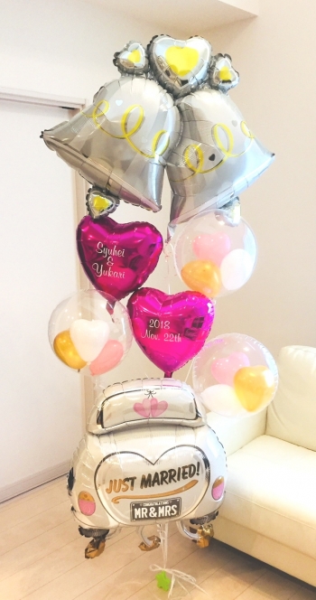 | 仕様 | ビッグサイズ ベル型バルーン 1個 ビッグサイズ ウェディングカー型バルーン 1個 名まえ入りハート型バルーン 1個 日にち入りハート型バルーン 1個 クリアバルーン(ハートバルーン3球入) 3個 |