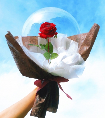 ドーム状のクリアバルーンの中に深紅のローズアートフラワー(造花)が入った新感覚のブーケです。プレゼントをもらった側だけでなく、渡す側もつい嬉しくなる新しいバルーンギフトです。