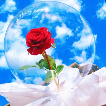 ドーム状のクリアバルーンの中に深紅のローズアートフラワー(造花)が入った新感覚のブーケです。プレゼントをもらった側だけでなく、渡す側もつい嬉しくなる新しいバルーンギフトです。