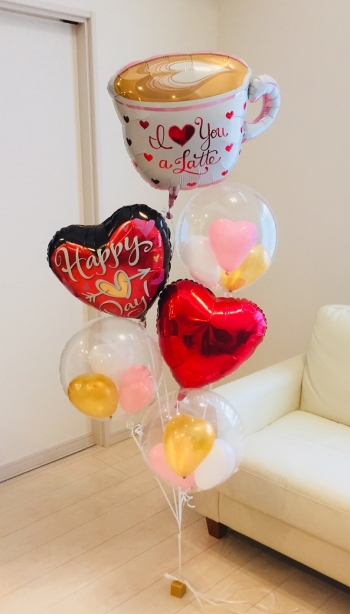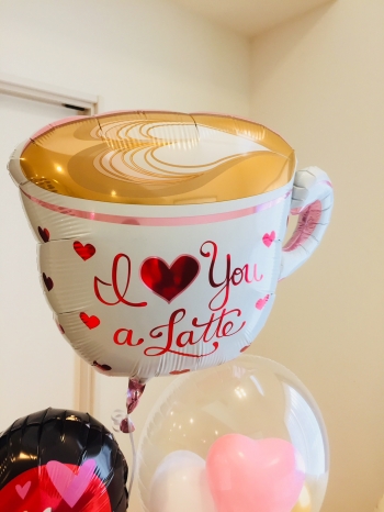 トップのカフェ・ラテのバルーンがとっても可愛らしい、カフェ・オープンのお祝いにピッタリのバルーン電報です!